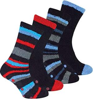 4er Pack Herren Kuschelsocken mit Noppen Warme Rutschfest Stoppersocken | Antirutsch Flauschige Bettsocken (39-45, Blau / roter Streifen)