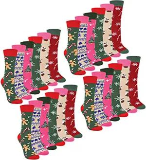 Damen Bunt Weihnachtssocken Atmungsaktiv Baumwolle Lustig Socken (37-42, 12 Pack)