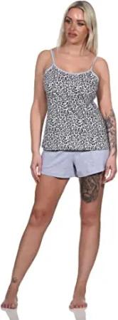 Ärmelloser Damen Spaghetti Träger Shorty Schlafanzug in Animal-Print Optik, Farbe:grau-Mel., Größe:44-46