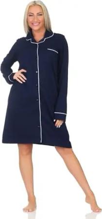 Damen Langarm Nachthemd zum durchknöpfen in Tupfenoptik - auch in Übergröße, Farbe:Marine, Größe:40-42