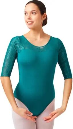 Ballett Trikot Damen 3/4 Ärmel - Ulla - BH-Pad-Einschub - Cut-Out Rücken - Netzärmel und -einsätze - türkis 40 - Tanz Body - Ballettkleidung für Erwachsene