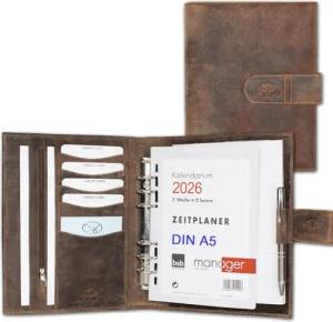 Leder A7 Kombimappe 2 Fächer mit Reißverschluss Kalender 2026 Premium Rindsleder Braun Vintage Geschenkbox Ledermappe Mappe Schreibmappe Terminplaner Terminkalender Ringbuchmappe (BV)