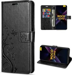 Handyhülle kompatibel mit Poco X7 Pro 5G | Premium PU Leder Handy Hülle Wallet Case | Schutzhülle Blumen Klapphülle | Schwarz