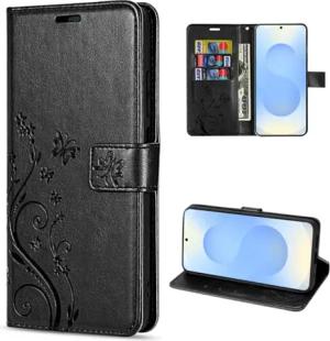Handyhülle kompatibel mit Samsung Galaxy S25 | Premium PU Leder Handy Hülle Wallet Case | Schutzhülle Blumen Klapphülle | Schwarz