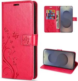 Handyhülle kompatibel mit Samsung Galaxy S25 Ultra | Premium PU Leder Handy Hülle Wallet Case | Schutzhülle Blumen Klapphülle | Rot