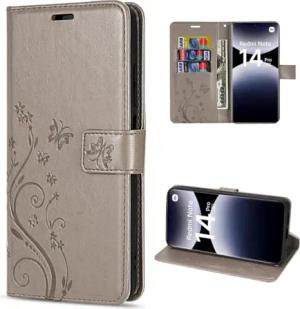 Handyhülle kompatibel mit Xiaomi Redmi Note 14 Pro 5G | Premium PU Leder Handy Hülle Wallet Case | Schutzhülle Blumen Klapphülle | Grau