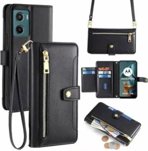 Handykette kompatibel mit Motorola Moto G05 / Moto E15 | Leder Handyhülle mit Kartenfächern | Handyhülle zum Umhängen | Schwarz