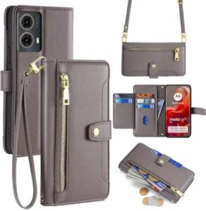 Handykette kompatibel mit Motorola Moto G85 | Leder Handyhülle mit Kartenfächern | Handyhülle zum Umhängen | Grau