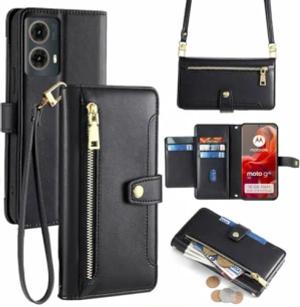 Handykette kompatibel mit Motorola Moto G85 | Leder Handyhülle mit Kartenfächern | Handyhülle zum Umhängen | Schwarz