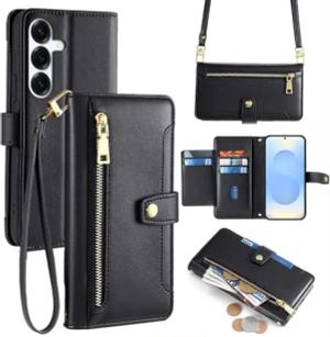 Handykette kompatibel mit Samsung Galaxy S25 | Leder Handyhülle mit Kartenfächern | Handyhülle zum Umhängen | Schwarz