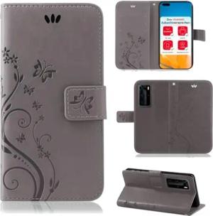 Hülle Kompatibel mit Huawei P40 Pro | Premium PU Leder Handyhülle Wallet Case für P40 Pro | Schutzhülle Blumen Klapphülle Handyhülle | Grau