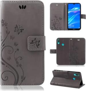 Hülle Kompatibel mit Huawei Y7 (2019) | Premium PU Leder Handyhülle Wallet Case für Y7 (2019) | Schutzhülle Blumen Klapphülle Handyhülle | Grau
