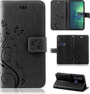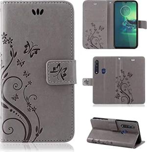 Hülle Kompatibel mit Motorola Moto G8 Plus | Premium PU Leder Handyhülle Wallet Case für Moto G8 Plus | Schutzhülle Blumen Klapphülle Handyhülle | Grau
