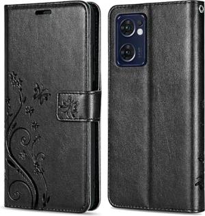 Hülle Kompatibel mit Oppo Find X5 Lite | Premium PU Leder Handyhülle Wallet Case für Find X5 Lite | Schutzhülle Blumen Klapphülle Handyhülle | Schwarz