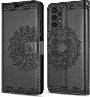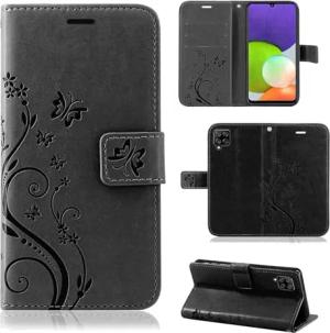 Hülle Kompatibel mit Samsung Galaxy A22 4G | Premium PU Leder Handyhülle Wallet Case für Galaxy A22 4G | Schutzhülle Blumen Klapphülle Handyhülle | Schwarz