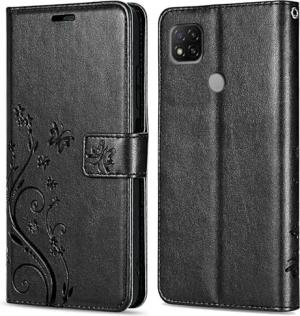Hülle Kompatibel mit Xiaomi Redmi 9C | Premium PU Leder Handyhülle Wallet Case für Redmi 9C | Schutzhülle Blumen Klapphülle Handyhülle | Schwarz