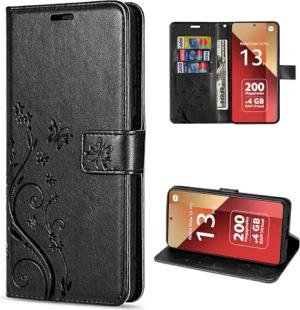 Hülle Kompatibel mit Xiaomi Redmi Note 13 Pro 4G | Premium PU Leder Handyhülle Wallet Case für Redmi Note 13 Pro 4G | Schutzhülle Blumen Klapphülle Handyhülle | Schwarz