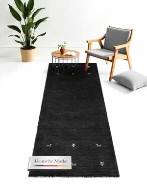 Wollteppich Gabbeh Uni Läufer Schwarz 80x300 cm | Moderner Teppich für Wohn- und Schlafzimmer