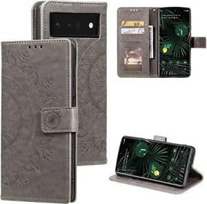 Handytasche kompatibel mit Google Pixel 6 - Handy Case mit Kartenfach Handyhülle - Flipcase klappbar Motiv Mandala Grau