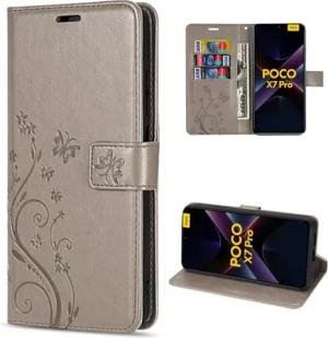 Handyhülle kompatibel mit Poco X7 Pro 5G | Premium PU Leder Handy Hülle Wallet Case | Schutzhülle Blumen Klapphülle | Grau
