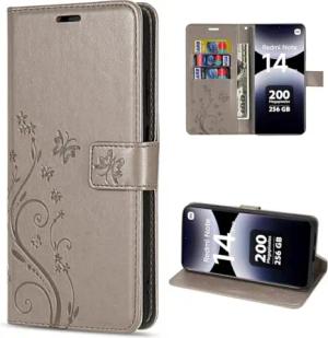 Handyhülle kompatibel mit Xiaomi Redmi Note 14 Pro 5G | Premium PU Leder Handy Hülle Wallet Case | Schutzhülle Blumen Klapphülle | Grau