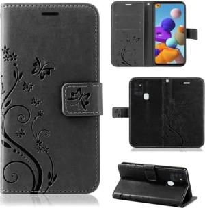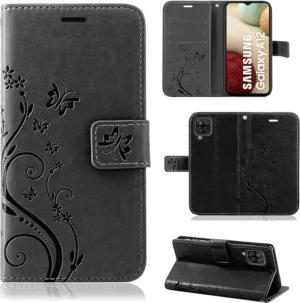 Hülle Kompatibel mit Samsung Galaxy A02s | Premium PU Leder Handyhülle Wallet Case für Galaxy A02s | Schutzhülle Blumen Klapphülle Handyhülle | Schwarz