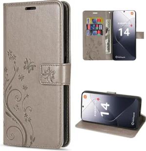 Hülle Kompatibel mit Xiaomi 14 | Premium PU Leder Handyhülle Wallet Case für 14 | Schutzhülle Blumen Klapphülle Handyhülle | Grau