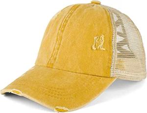 Damen Baseball Cap im Washed Used Look mit Mesh Einsatz | Ponytail Cap für hohen Zopf | Verstellbare 6-Panel Schildkappe für Sommer und Freizeit, Farbe:Gelb