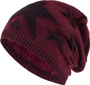 Sternen Wintermütze warm gefütterte Beanie Flechtmuster Einheitsgröße Mütze, Farbe:Dunkelrot