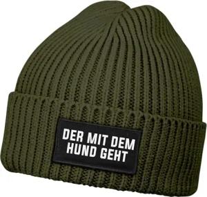 Herren Beanie mit Patch Strickmütze mit Spruch Der mit dem Hund geht Aufdruck Lustig Mütze Männer Oliv Unisize