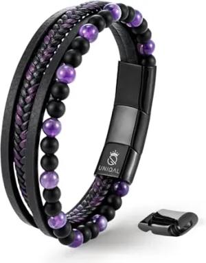 UNIQAL | Echtleder Armband Herren mit Natursteinen "FANCY" Mens nature stone Bracelet | Edelstahl, Männer | Etui Box Gratis (LILA AMETHYST, 23)