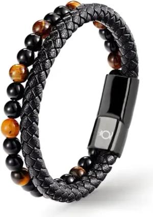UNIQAL | Echtleder Armband Herren mit Natursteinen "FANCY" Mens nature stone Bracelet | Edelstahl, Männer | Etui Box Gratis (ROTES TIGERAUGE, 21)
