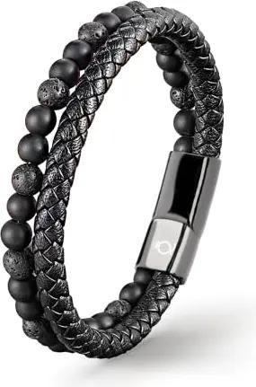 UNIQAL | Echtleder Armband Herren mit Natursteinen "PASSION" Mens nature stone Bracelet | Edelstahl, Männer | Etui Box Gratis (LAVASTEIN SCHWARZ, 19)