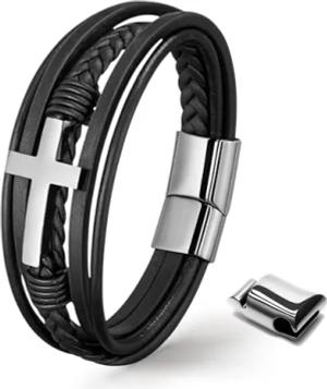 UNIQAL | Kreuz Leder Armband "GLORY" Cross Bracelet | Geschenk Box | Magnetverschluss (Silber, 23)