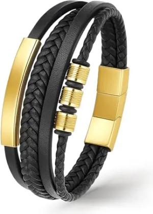 UNIQAL | Lederarmband Herren "BLACK SHAPE" Mens Bracelet | Edelstahl, Echtleder | Etui Box Gratis (Gold, 21)