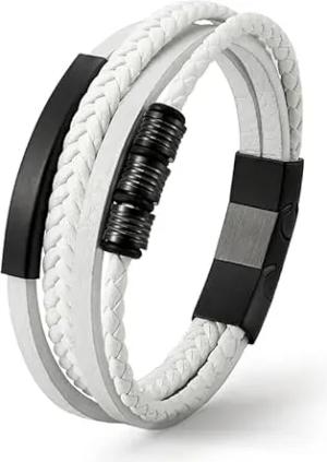 UNIQAL | Lederarmband Herren "BLACK SHAPE" Mens Bracelet | Edelstahl, Echtleder | Etui Box Gratis (Weiß, 23)