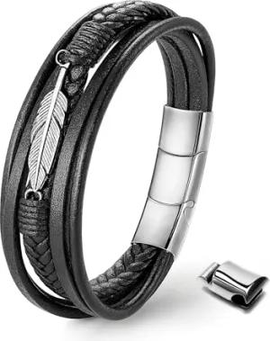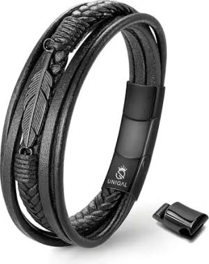UNIQAL | Lederarmband Herren "FEATHER" Mens Bracelet | Edelstahl, Echtleder | Etui Box Gratis (Schwarz, 23)
