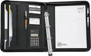 581101 Collegemappe A4, genarbtes Kunstleder, Reißverschluss, mehrere Fächer, herausnehmbare 4-Ring-Mechanik, Stiftschlaufen, inkl. Solar Taschenrechner, schwarz