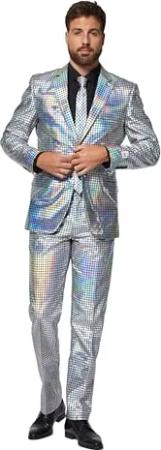 Silberner Anzug für Herren, Silvesterparty, holografisches Karomuster, Silber, inklusive passender Jacke, Hose und Krawatte, Silber, 48