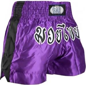 Remy Thaiboxhose Kickboxhose Muay Thai Hose kurz aus Polyester mit traditioneller Thaischrift Lila/Schwarz für Damen, Herren, Kinder, Erwachsene, Mädchen, Jungen Größe XL