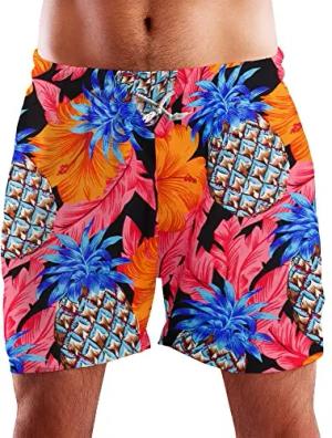 Funky Hawaii Schwimm-Hose Bade-Hose Bade-Shorts, Pineapple Hibiscus, Schwarz Rot, XXL
