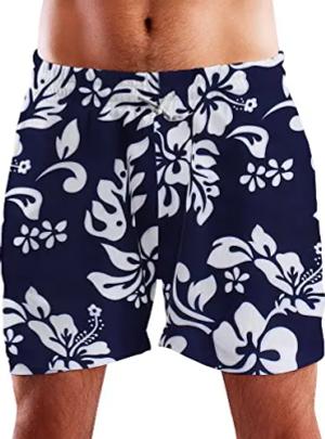 Funky Hawaii Schwimm-Hose Bade-Hose Bade-Shorts, Hibiscus, Weiß Navyblau, M