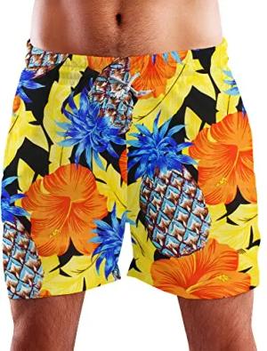 Funky Hawaii Schwimm-Hose Bade-Hose Bade-Shorts, Pineapple Hibiscus, Schwarz Gelb, XL