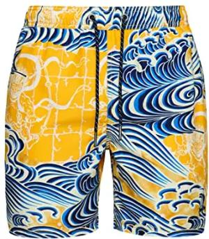Herren Hawaiianische Badeshorts aus recyceltem Material Nimi-Kam-Blau/Gelb Bedruckt S