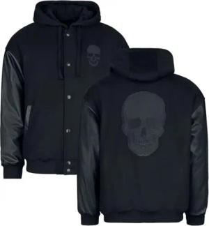 Herren schwarze College Jacke in Woll-Optik mit Totenkopf-Stickerei L