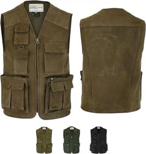 Herren Jagd Lederweste Jagdweste aus Nubuckleder - Freizeit 9-Taschen Angelweste - Outdoor Camping Multi-Taschen Angler Weste - Multifunktionsweste Tarnweste Jagdgrün - 48