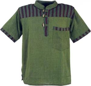 GURU SHOP Nepal Fischerhemd, Gestreiftes Goa Hippie Kurzarmhemd - Olive, Herren, Size:XL