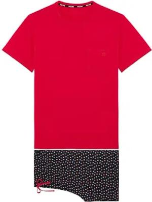 Herren Pyjama Court Charli Pyjamaset, Oberteil: einfarbig, rot, unten Bedruckt, gepunktet, Mehrfarbig. Schwarzer Hintergrund, L