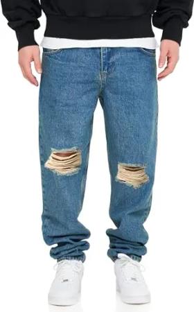. Herren Jeans Ripped Tapered-Fit Jeanshose 100% Baumwolle Denim Baggy Hose Used Look Men's DC_JN-244-Medium Blue-W38/L32