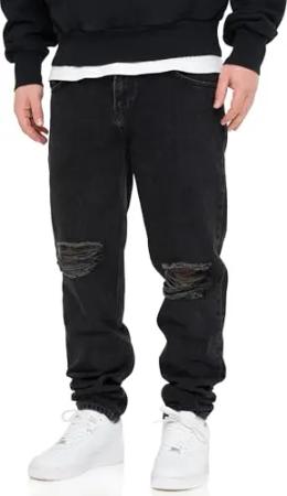 . Herren Jeans Ripped Loose-Fit Jeanshose 100% Baumwolle Denim Baggy Hose Straight-Leg Used Look Men's DC_JN-249-Washed Black-W32/L32